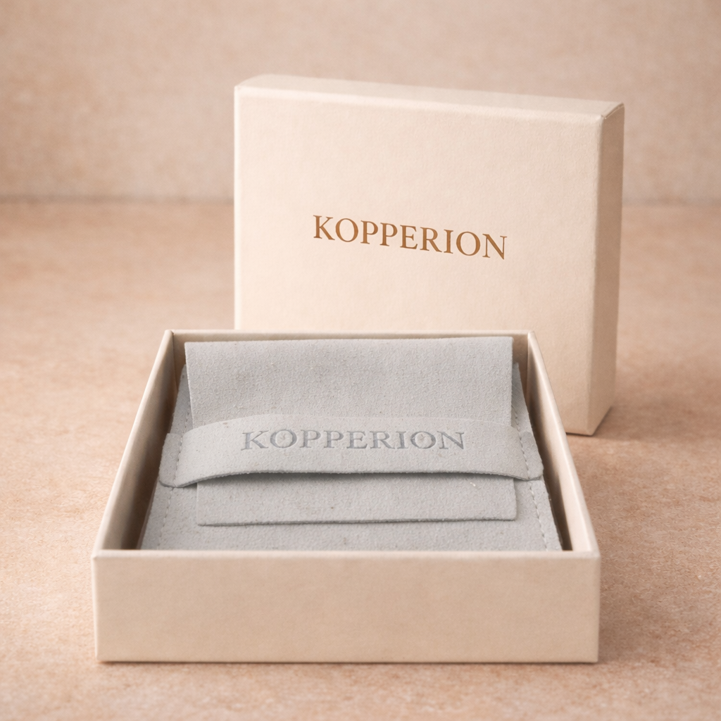 Cada peça foi polida com precisão artesanal para preservar a textura nobre do cobre e permitir o contacto direto com a pele, onde o seu poder atua: subtil, constante, real.